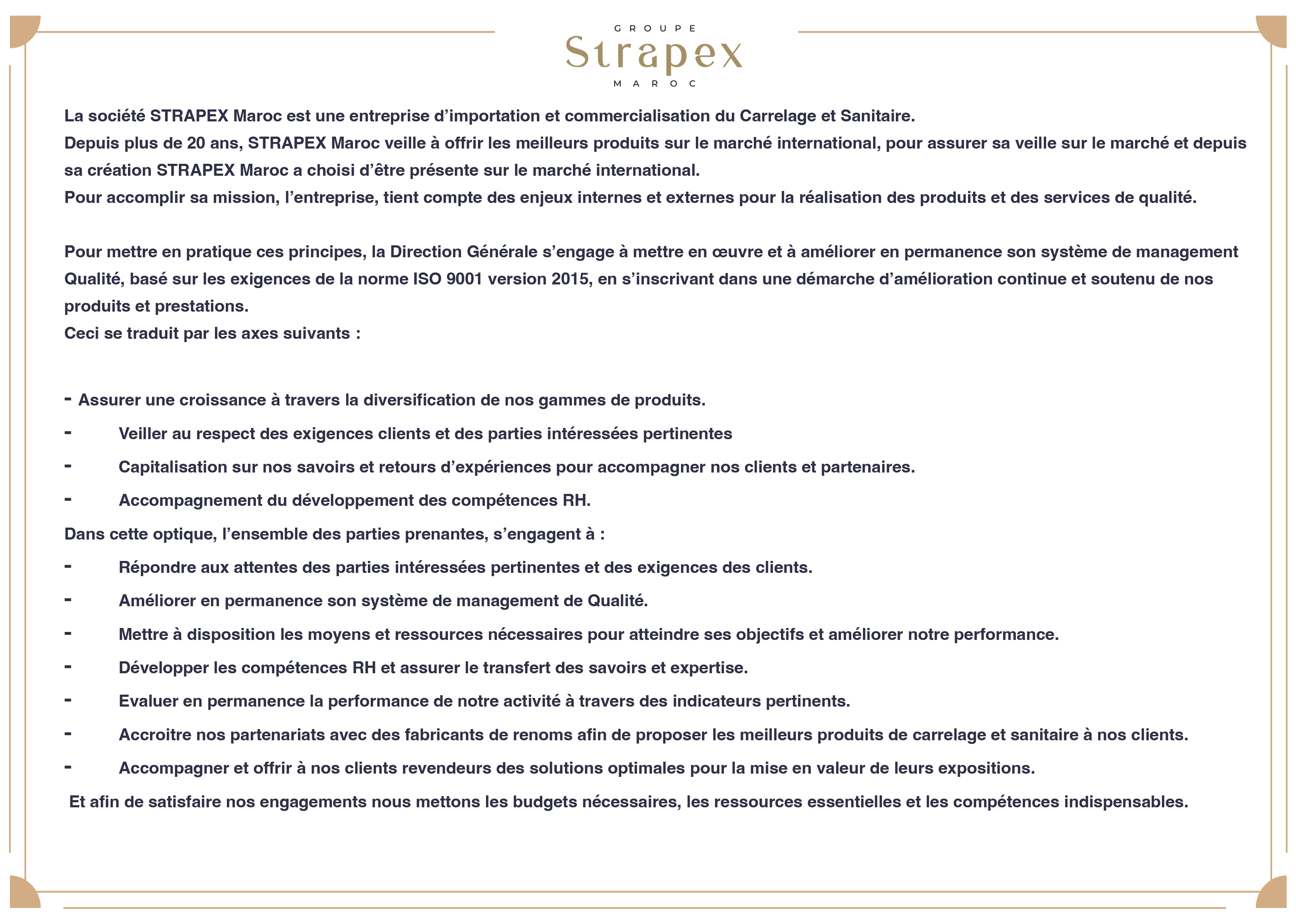 Fondée en 2000 par son président, M. Youssef Belkaid, la société STRAPEX Maroc a su s'imposer comme un acteur incontournable. D'abord spécialisée dans le trading, elle a élargi ses activités en 2004 dans la distribution de carrelages et de sanitaires haut de gamme.